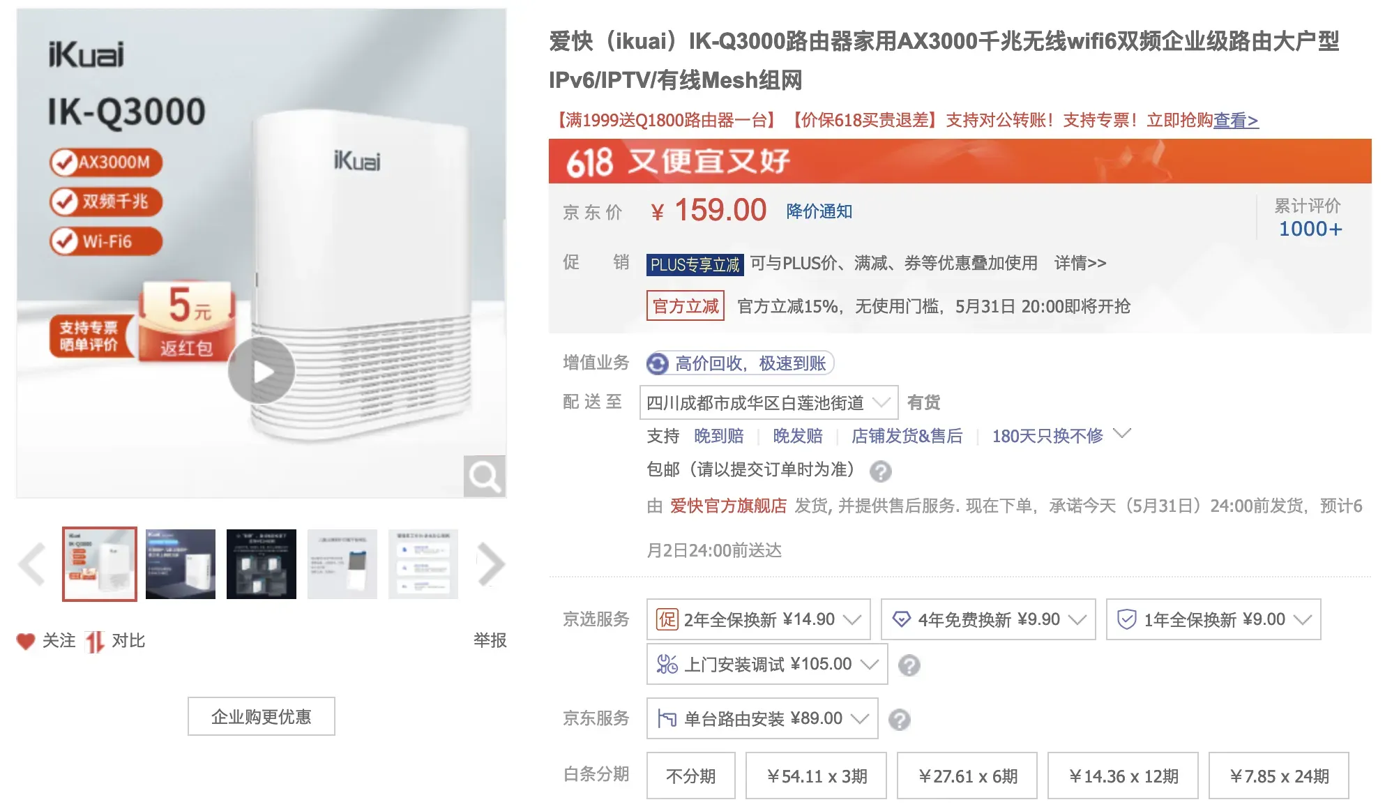 其实我个人目前比较推荐的机器是爱快IK-Q3000,不用刷机就能享受官方的爱快的系统固件,机身自己支持AX3000,如果没有其他无线组网,一台机器就能解决大部分人家中的路由和WiFI了。现在这个机器京东售价159,同样所谓mt7981芯片的机器,他也就比别的机器贵了20-30。30块钱买个免刷机带售后的爱快系统我觉得还是挺香的。(不过不清楚这台机器有没有硬件转发,如果没有的话还是不要用了)