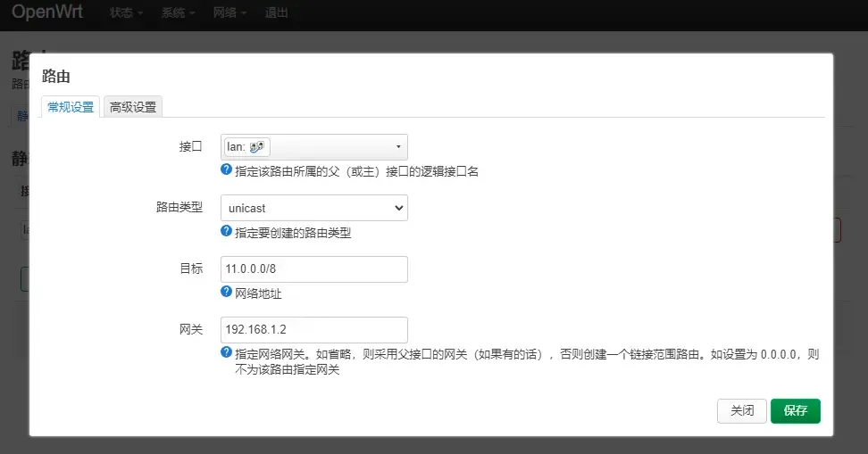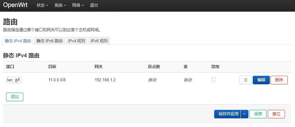 打开 网络→路由→静态 IPv4 路由,添加一条新的静态路由,类型unicast,目标11.0.0.0/8,网关192.168.1.2。