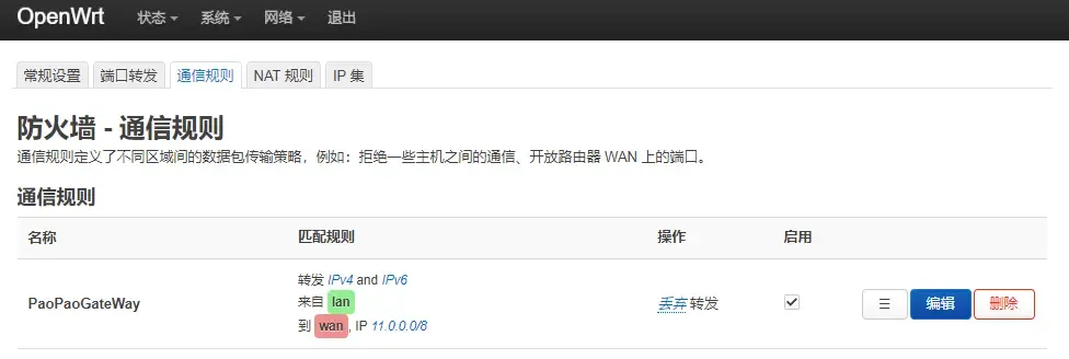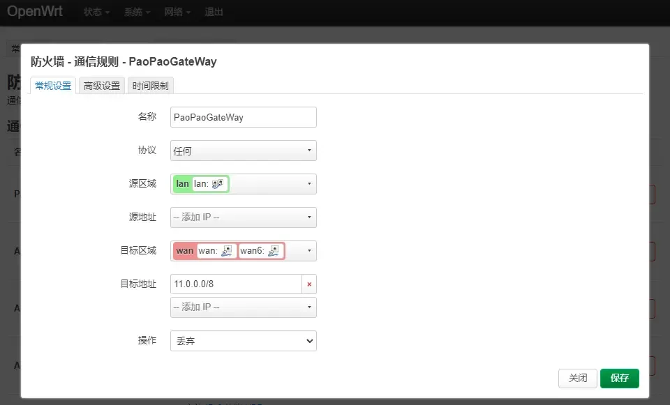 打开 网络→防火墙→通信规则,添加一条新的规则,源区域为lan,目标区域为wan,目标地址为11.0.0.0/8,操作为丢弃。