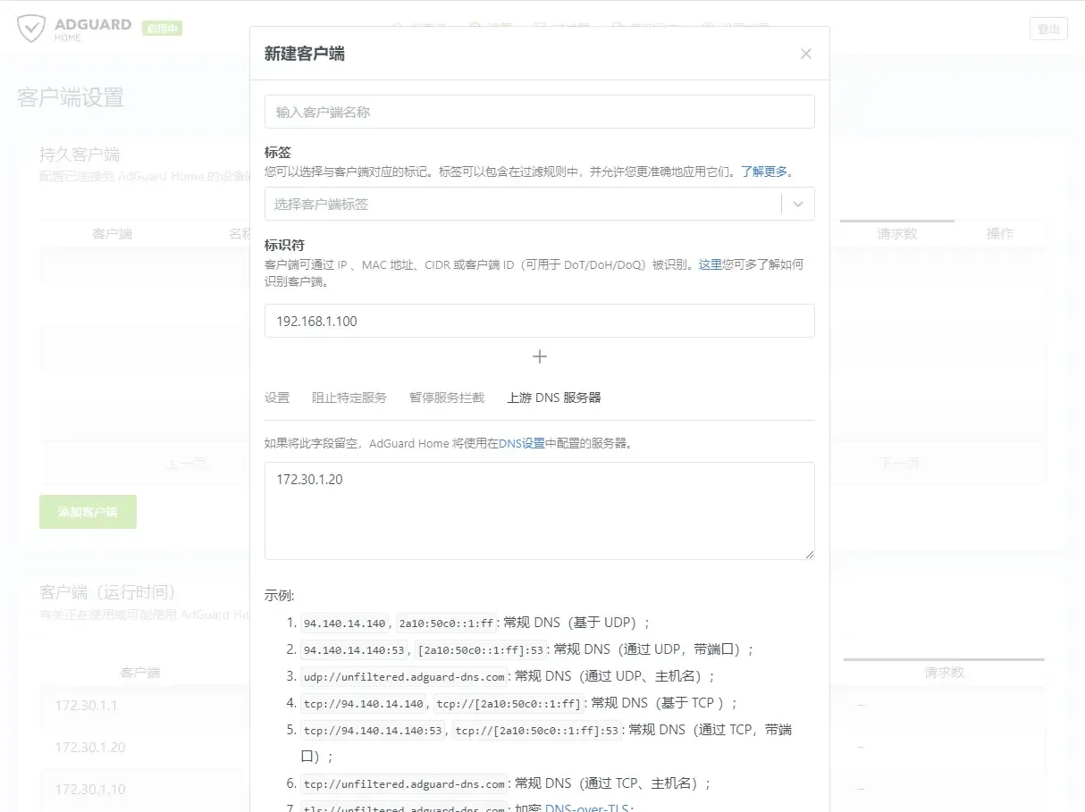 添加需要出国的设备的IP或者IP段,然后在下面的自定义上游的地方,将上游DNS设置为172.30.1.20,然后保存即可。