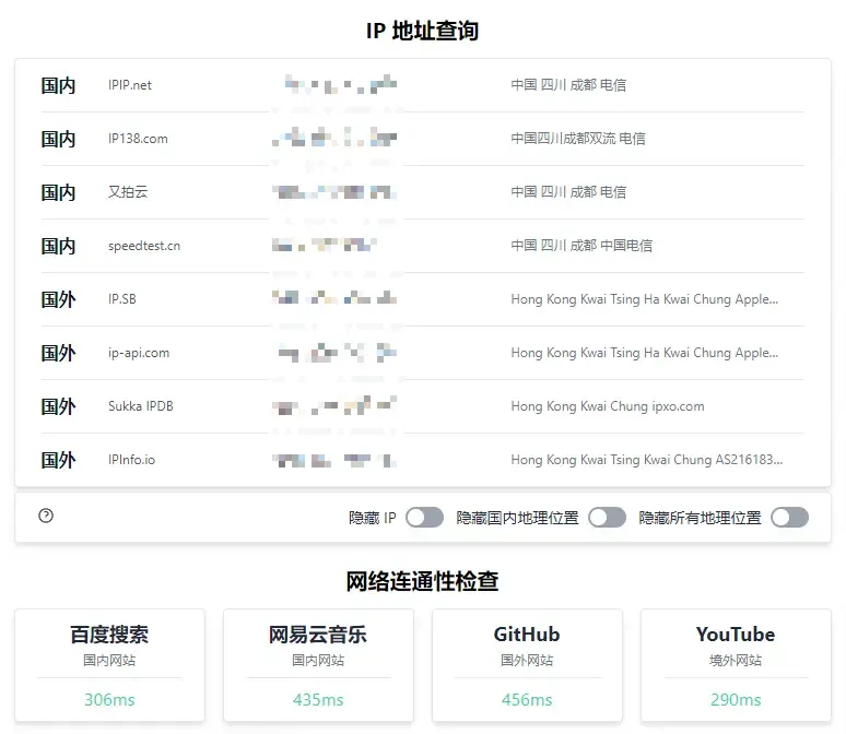 可以在https://ip111.cn或者https://ip.skk.moe检查一下IP分流是否正常。