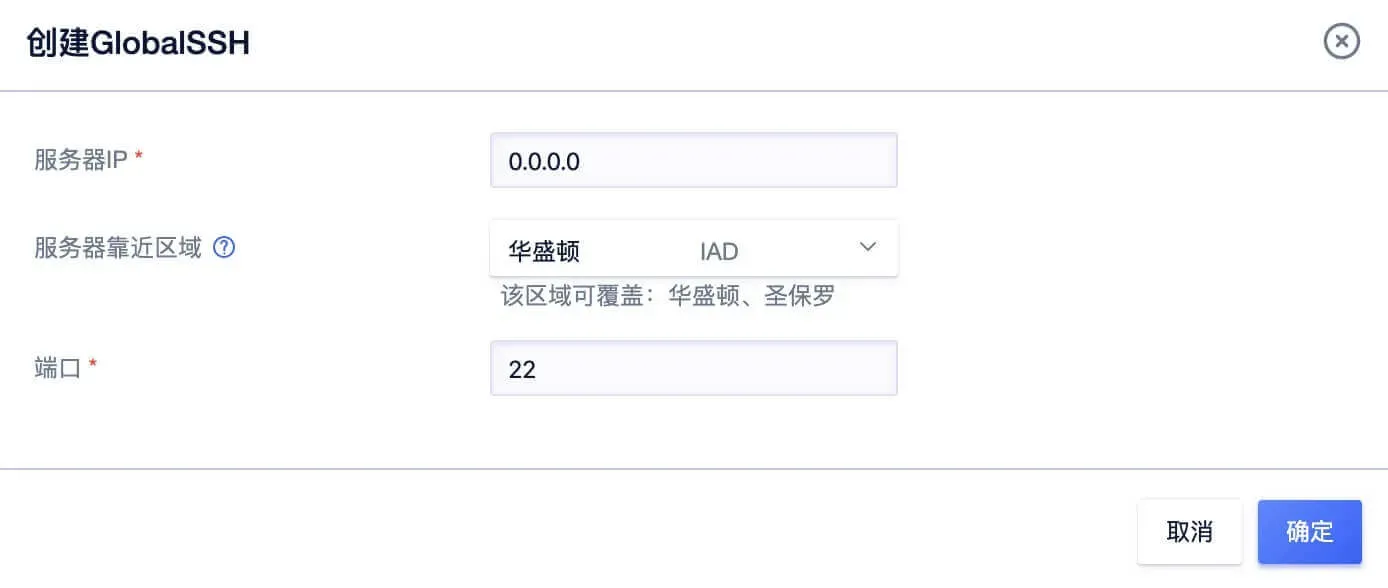 点击创建,填写服务器的IP和需要加速的SSH端口,然后可以选择加速区域,这里选择离服务器所在地最近的就可以。