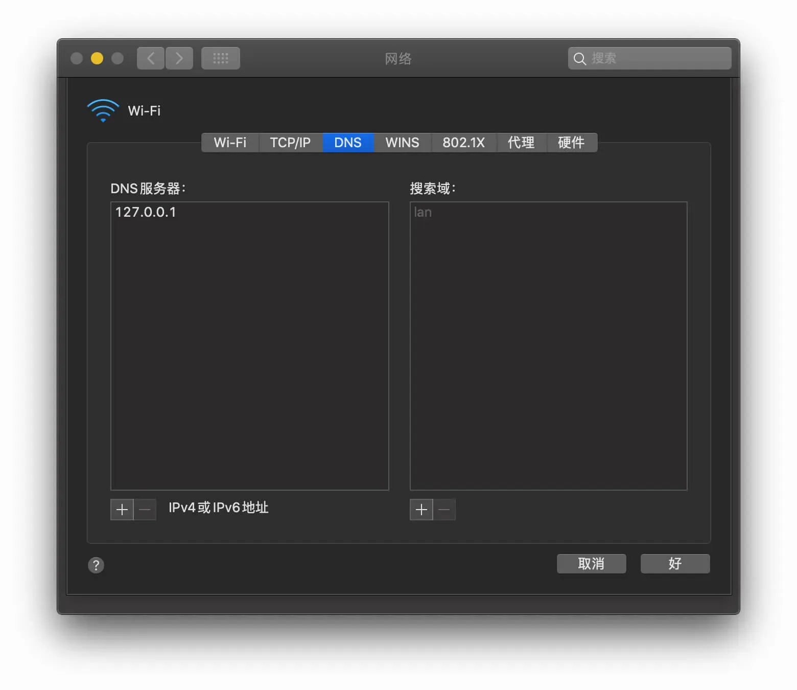 之后再把网络设置里的DNS地址修改为127.0.0.1,应用之后就可以享受无污染的DNS了。