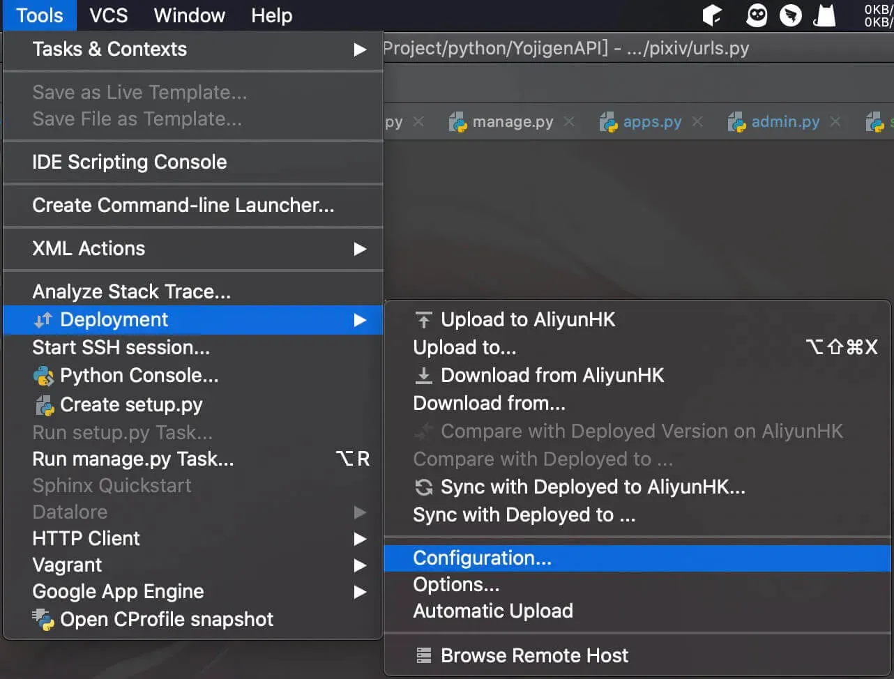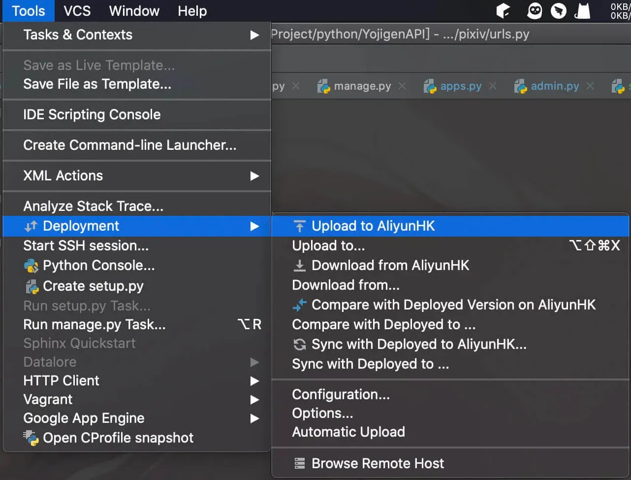 最后点击PyCharm的菜单栏的Tools —> Deployment —> Upload to AliyunHK,就可以将代码推送到服务器上了
