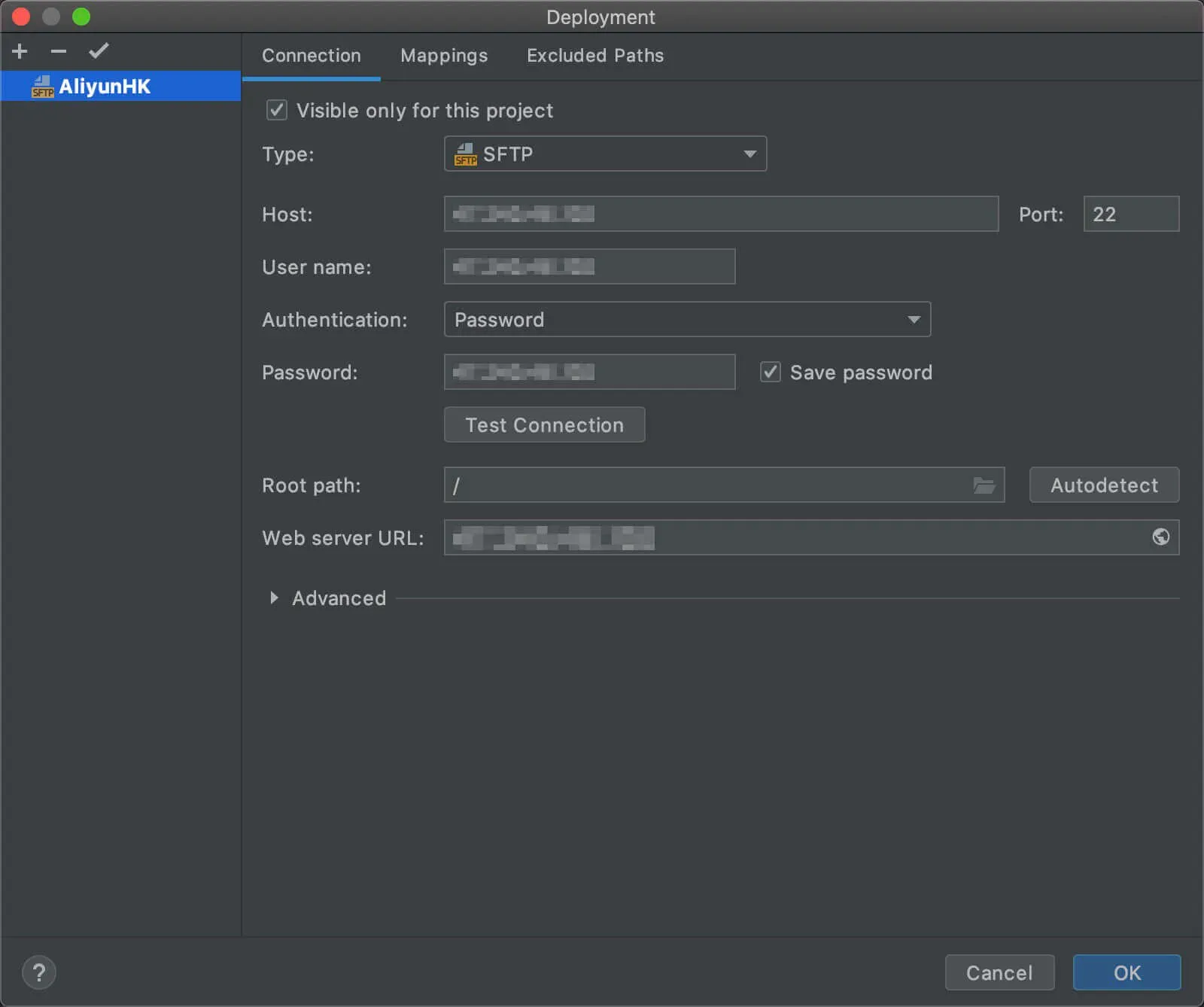 在里面添加一个新的服务器,我添加的服务器命名为AliyunHK,输入好服务器的登陆信息