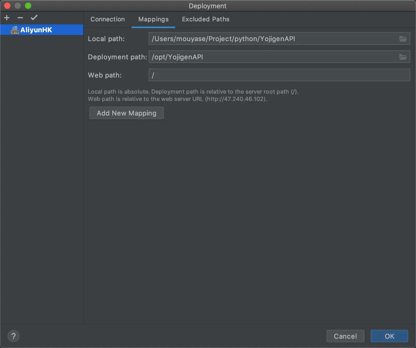 然后到Mappings页面,添加一下文件夹对应的路径配置,我这里是将代码放到了服务器的/opt/YojigenAPI目录下