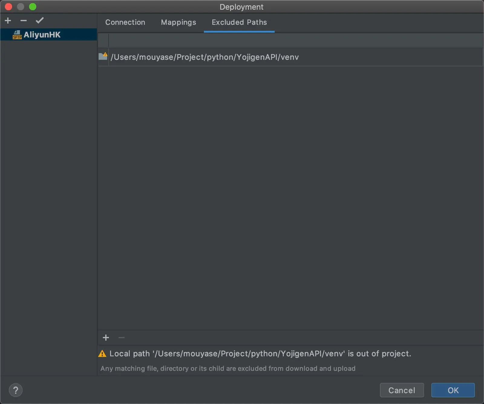 最后到Excluded Paths页面,添加一个Local Path,忽略掉本地的venv虚拟环境文件夹