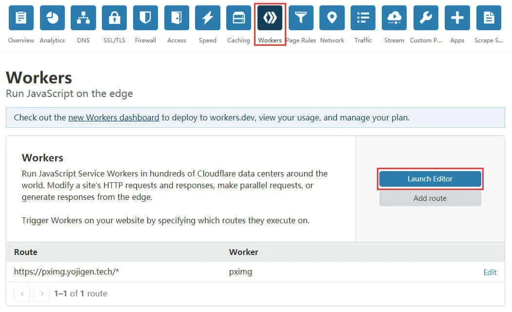 然后打开你的域名管理页面,点击上面的Workers,再点击Launch Editor,进入脚本编辑器。