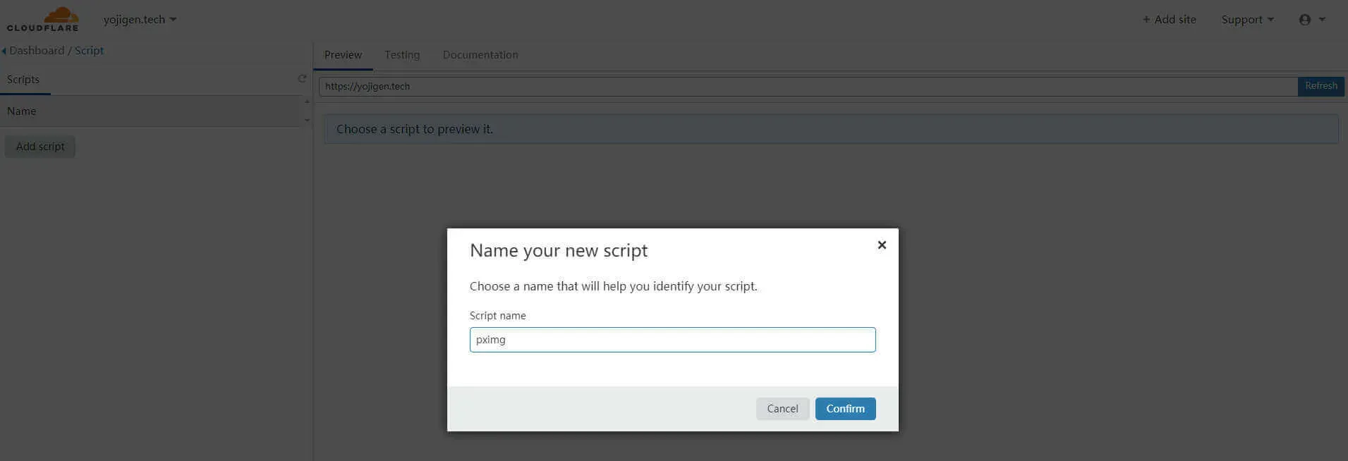 在编辑器中,点击左侧的Add script,之后输入脚本的名称,随便填一个pximg就好,之后点击Confirm创建脚本。