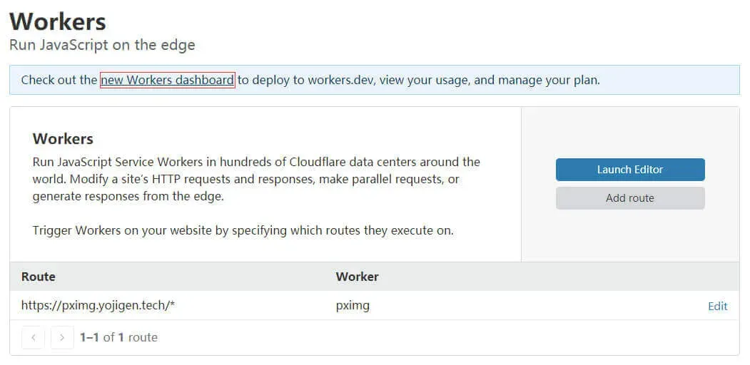 再之后点击new Workers dashboard,根据提示创建一个二级域名。例如我的二级域名是yojigen.workers.dev,而刚刚创建的脚本的域名就是pximg.yojigen.workers.dev。