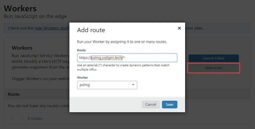 之后点击Add route,填写https://你的域名/*,并且下面选择刚刚创建的脚本,举例如图。